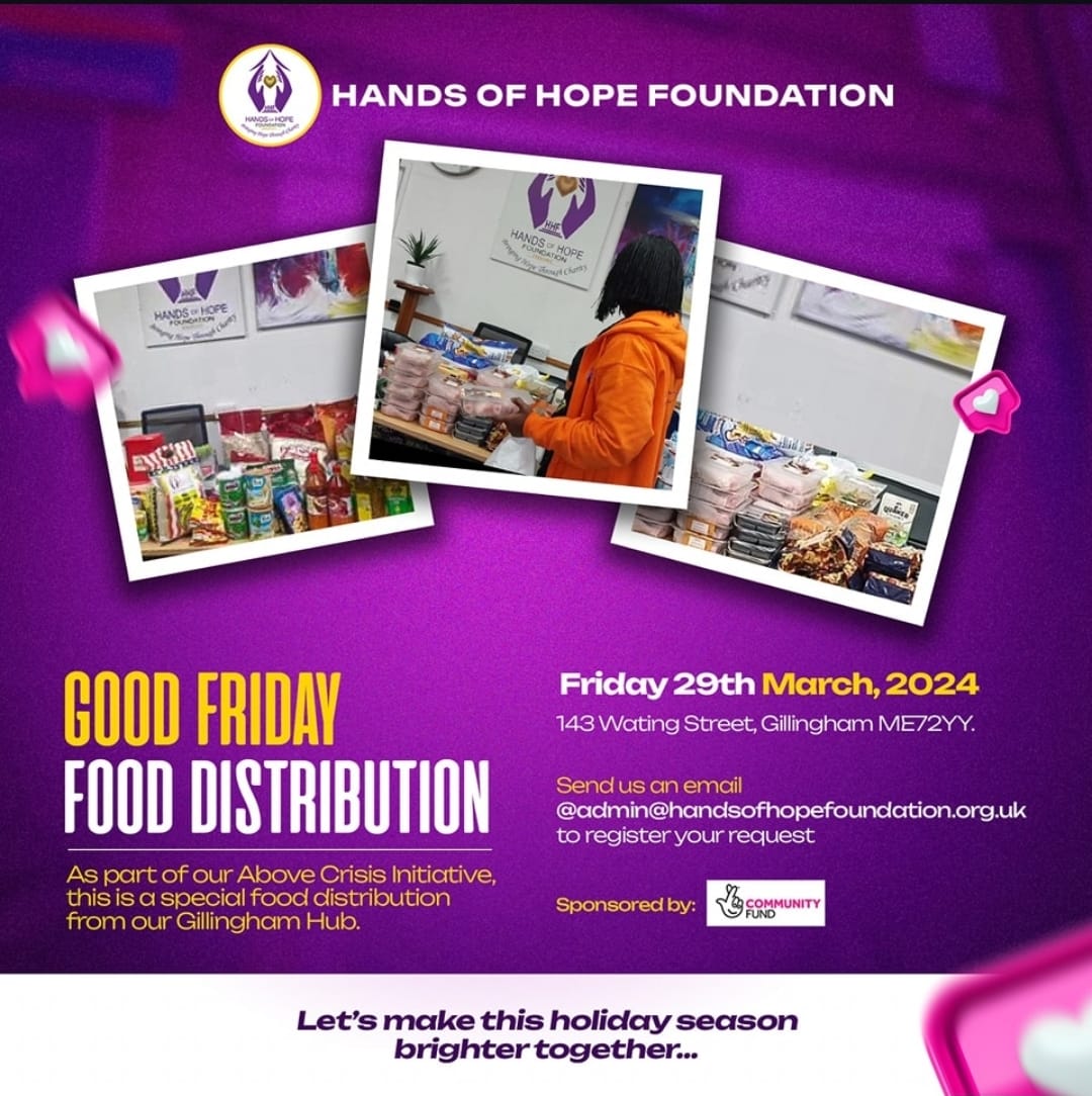 Every Easter, Hands of Hope Foundation launches the “Good Friday Food Distribution” campaign, a heartfelt initiative aimed at spreading hope and support to those in need. This campaign takes place both at our Gillingham Hub in the UK and in Lagos, Nigeria, reflecting our commitment to serving communities both locally and internationally.